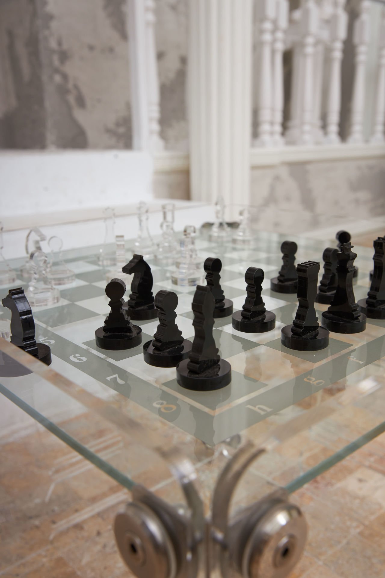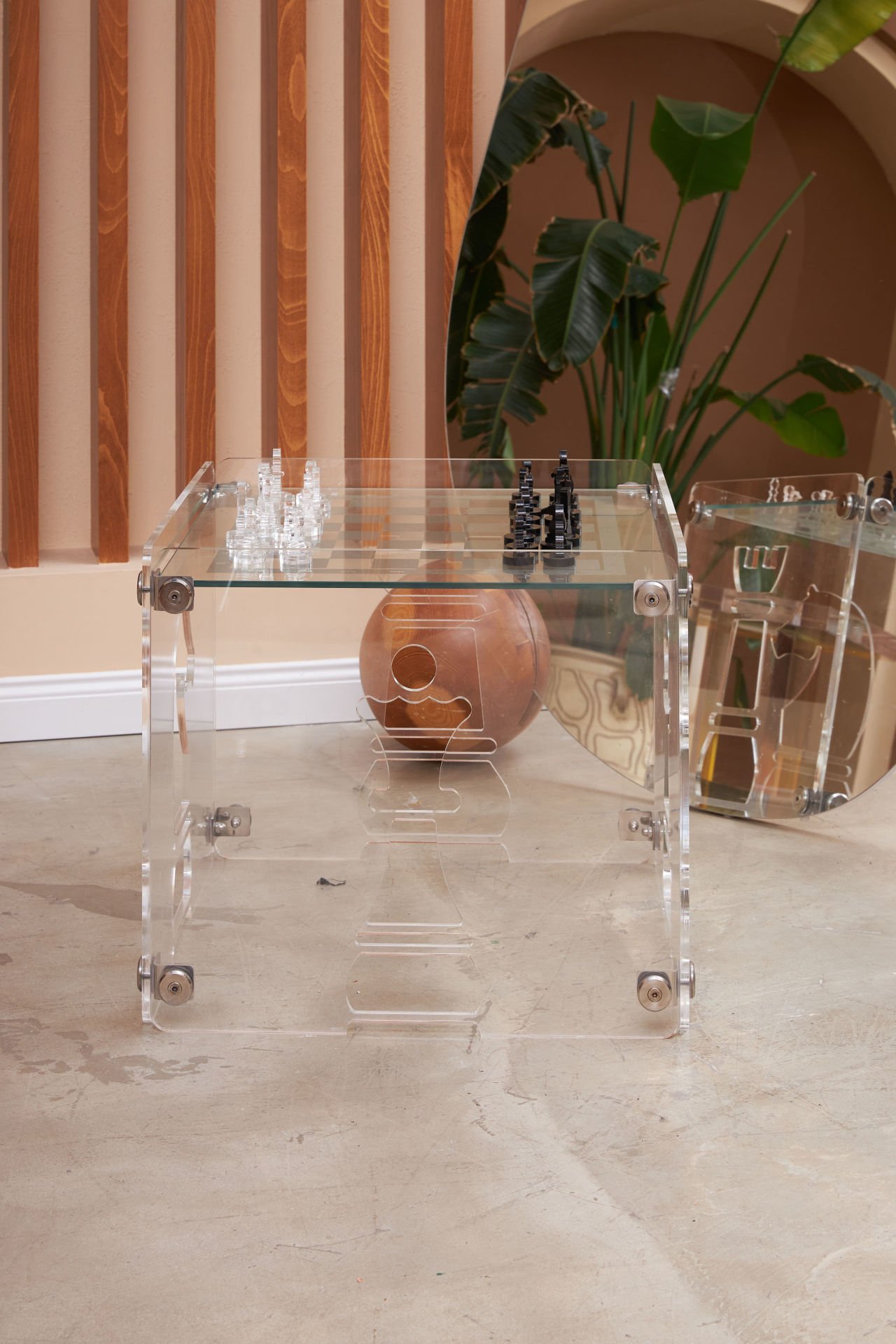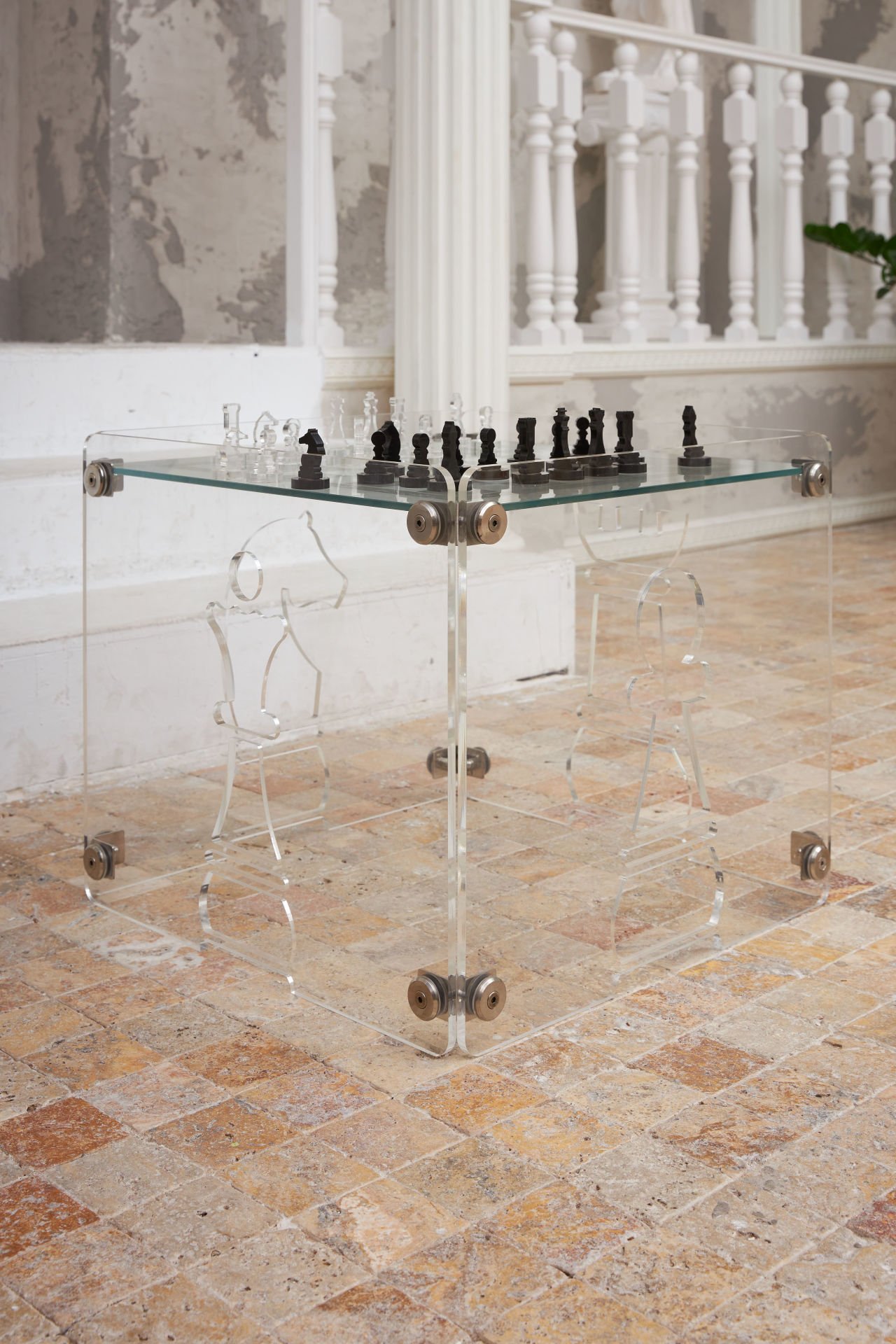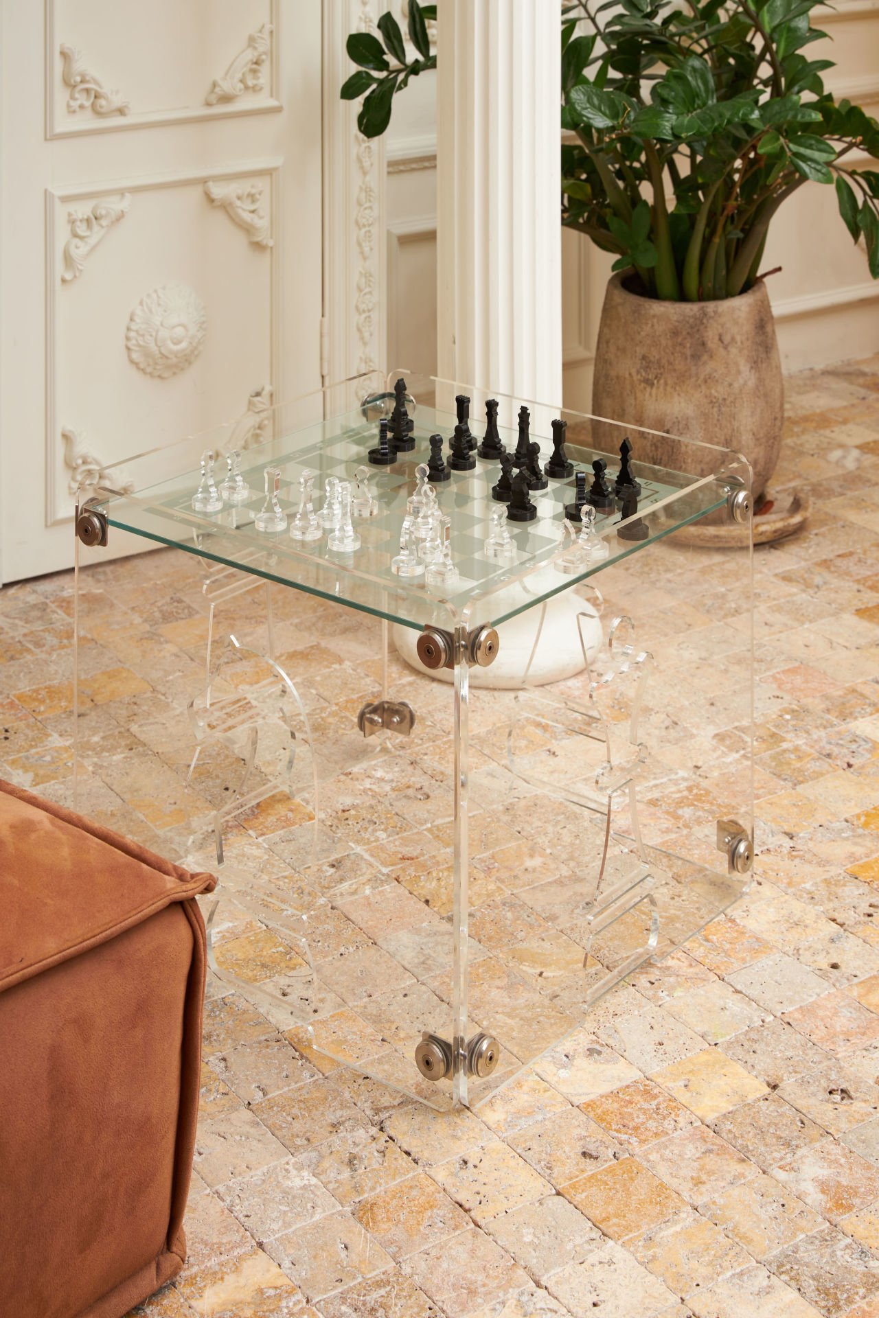 Gambit, şeffaf pleksi satranç masası. Zarafeti ve stratejiyi birleştiren modern bir tasarım harikası.