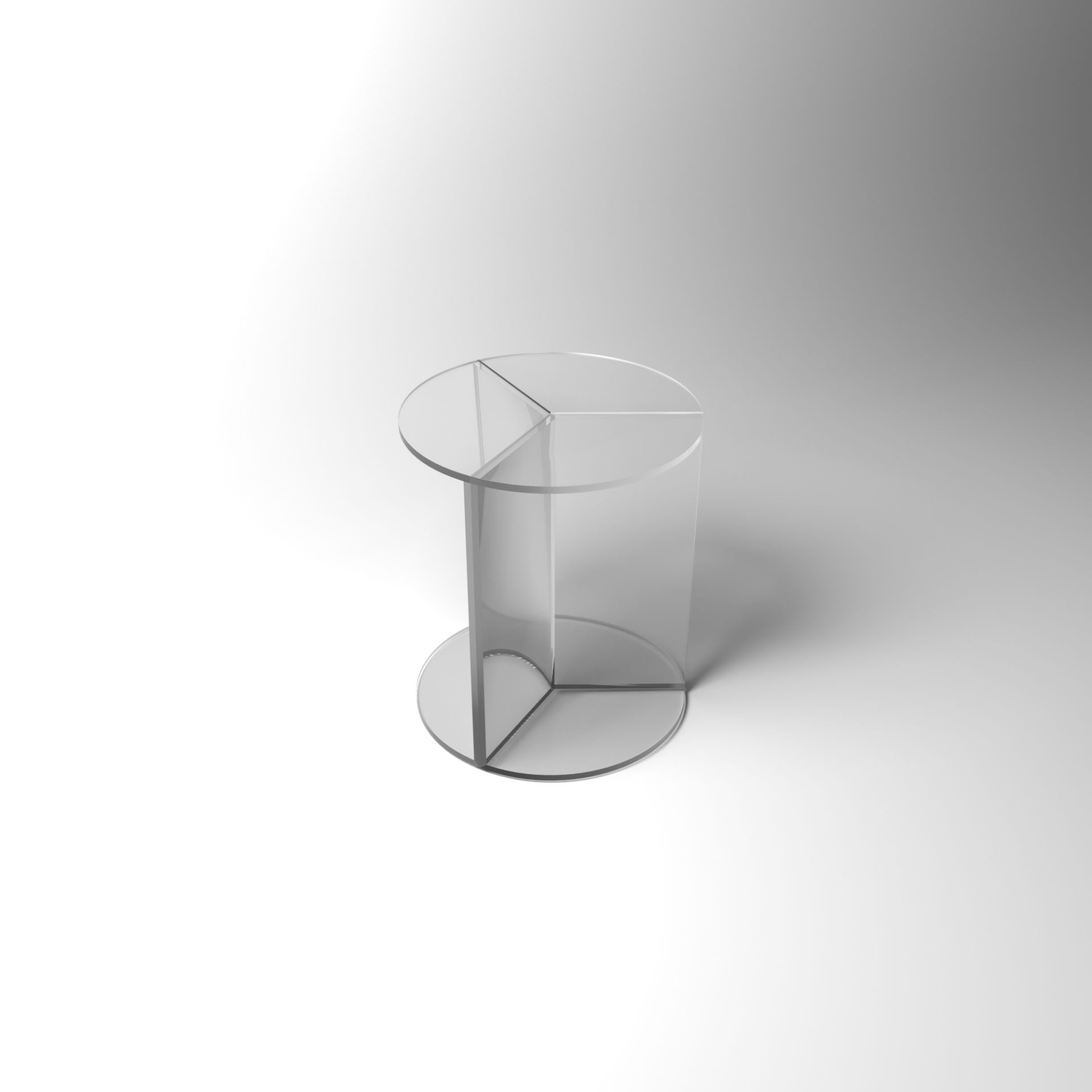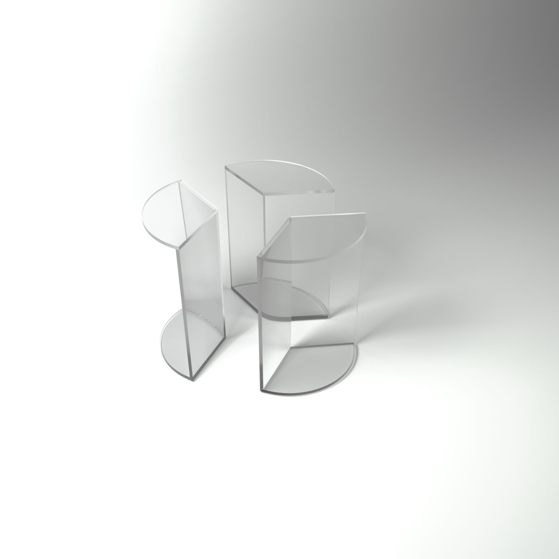 Nexus, üç parçalı modüler yapısıyla form, işlev ve estetiği bir araya getirirken, şeffaf tasarımıyla ışık ve renkleri yansıtan modern bir yan sehpa.