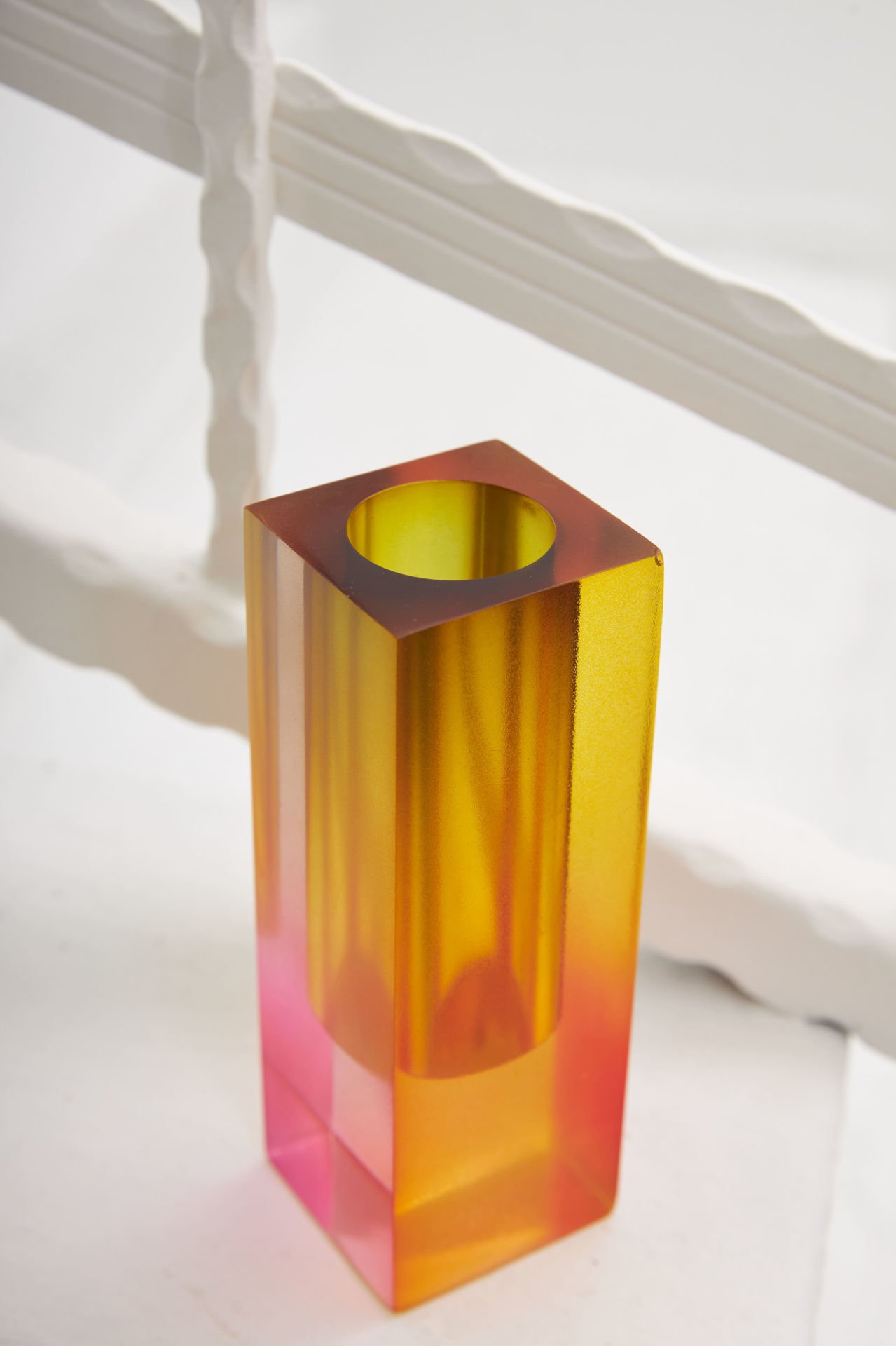 Saffron mumluk, el boyaması sarı ve turuncu pleksi tasarımıyla mekanınıza zarafet ve sıcaklık katar. Safranın değerli tonlarını yansıtan bu eşsiz ürünü keşfedin.